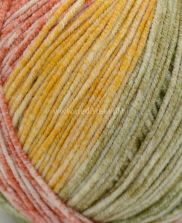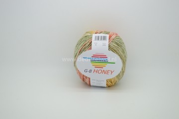 Honey (16) is een menging van katoen en acryl die in kleur verloopt. Door de samenstelling is dit garen perfect voor het maken van kledingstukken. Het garen pluist niet en blijft mooi in model. Door de twijning van de draad splijt het niet bij het haken en geeft een touch van fluweel.