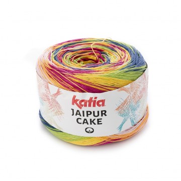 Katia Jaipur Cake (406) is een hoogwaardige dunne katoen die gestreept opwerkt. Door de grote looplengte heeft u maar 1 bol nodig om een leuk kledingstuk te maken. Doordat deze katoen zo dun en vrolijke zomerse kleuren heeft kunt u heerlijk dragende zomers jurkje, topje of omslagdoek maken.